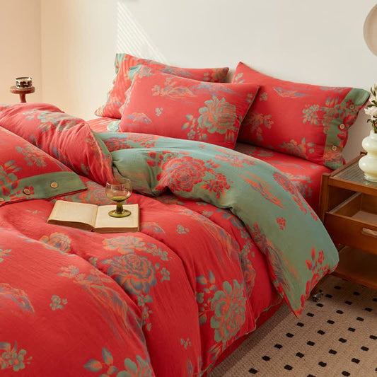 Parure de lit luxueuse en gaze de coton à motif pivoine (4 pièces)