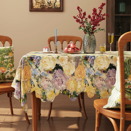 Nappe jacquard à bord festonné et motif floral style peinture à l'huile