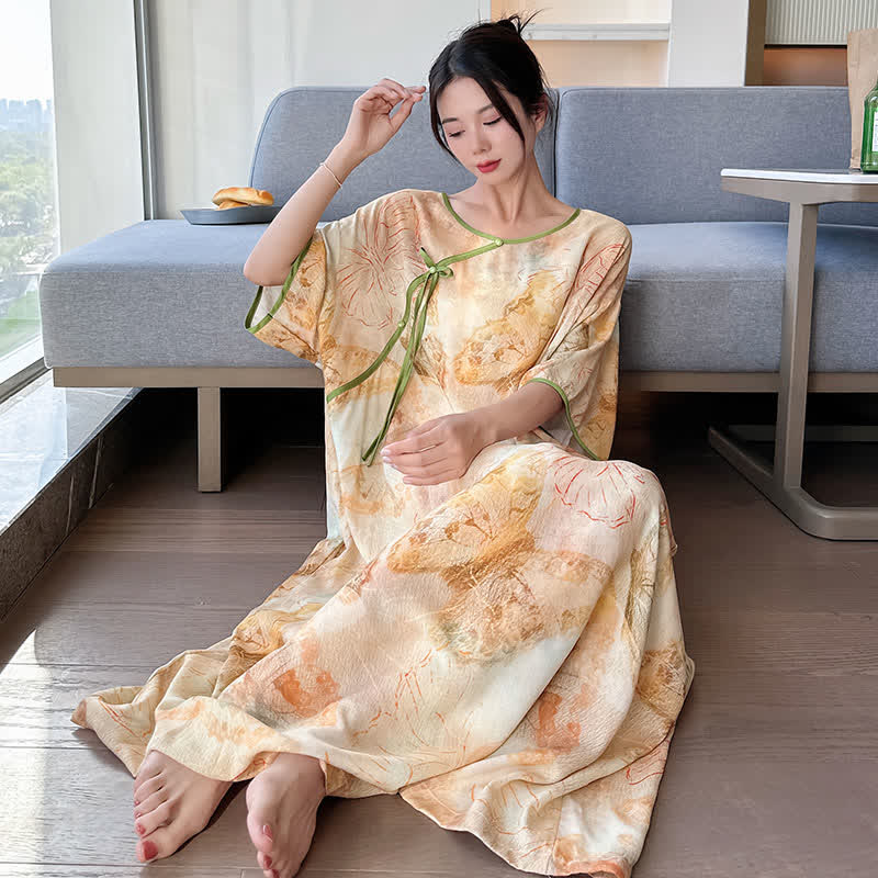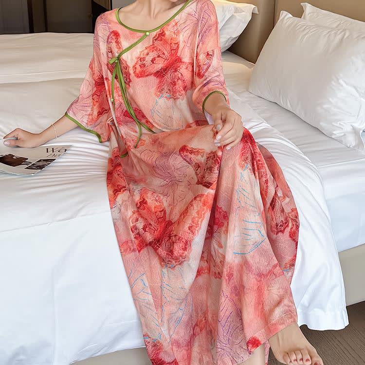 Cette chemise de nuit en tissu léger de haute qualité impressionne par son magnifique motif papillon, qui ajoute une touche de romantisme et souligne le charme unique d'une femme. Il est doté de poches pratiques des deux côtés pour plus de commodité à la maison.