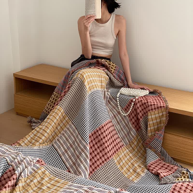 La couverture à pompons en gaze de coton à quatre couches avec un motif à carreaux allie style classique et douceur superposée. Fabriqué en gaze de coton respirante, il présente un motif à carreaux intemporel, un design confortable à quatre couches et de charmants accents de pompons, parfaits pour une atmosphère détendue et chaleureuse.