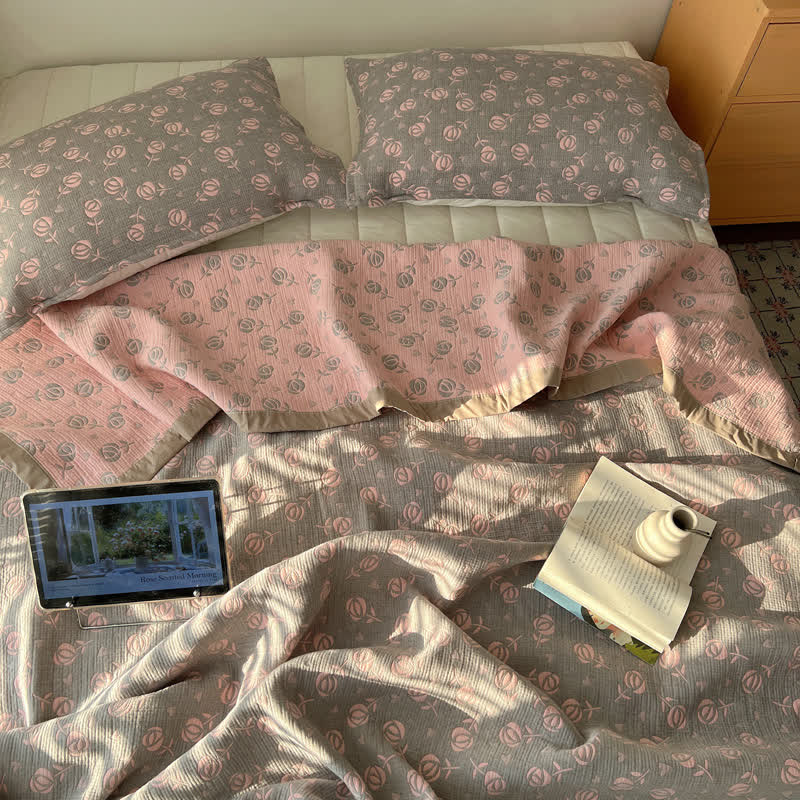 La couverture réversible en gaze de coton à motif rose présente un magnifique motif de rose sur un tissu en gaze de coton doux et respirant. Réversible pour deux looks élégants, il offre une sensation légère et confortable, le rendant parfait pour une utilisation toute l'année. En même temps, il ajoute une touche d’élégance florale à votre chambre.