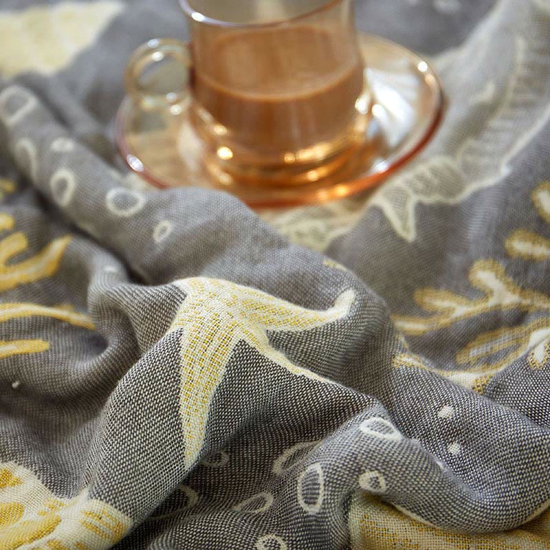 La couverture réversible avec un motif de vie marine donne à votre chambre un nouveau look – comme un bain dans le monde sous-marin. Couverture rafraîchissante à quatre couches en fibres de bambou teintes en fil avec technologie jacquard et texture tridimensionnelle. Les fibres de bambou ont une structure tubulaire et poreuse, sont hautement hygroscopiques et refroidissent donc sans absorber la chaleur. Ils sont hypoallergéniques et antibactériens. Point d'aiguille pour plus de durabilité et de résistance des couleurs. Cette couverture convient comme couverture d'été ou comme drap de lit. Il peut également être utilisé comme couverture de climatisation, couverture d'avion, couverture de chevet, couverture de canapé ou écharpe.