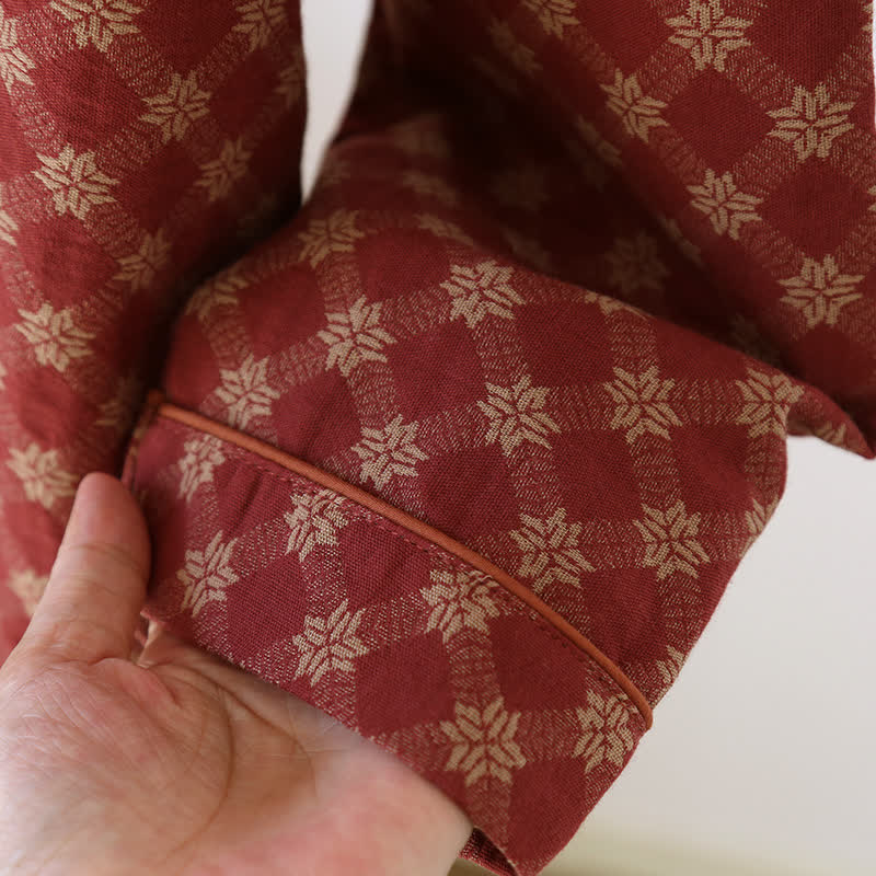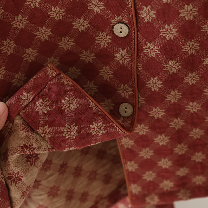 Fabriqué à partir de gaze de coton douce et respirante, cet ensemble de vêtements de détente est léger et épouse délicatement la peau, assurant un confort tout au long de la journée. Le motif jacquard de trèfle complexe ajoute une touche sophistiquée à vos vêtements de détente, créant un look élégant à la fois intemporel et moderne.