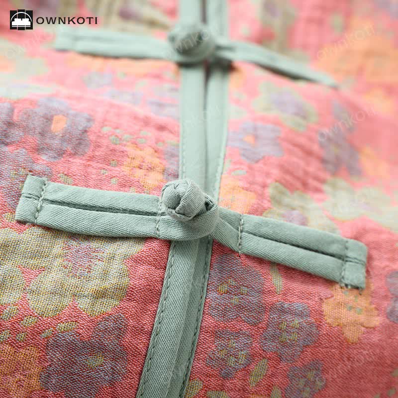 Cet ensemble de nuit en gaze de coton légère et respirante offre un confort exceptionnel toute l'année. Les touches amusantes des boutons grenouille lui confèrent une touche originale, tandis que le charmant motif floral ajoute une touche rafraîchissante à votre programme de soirée.