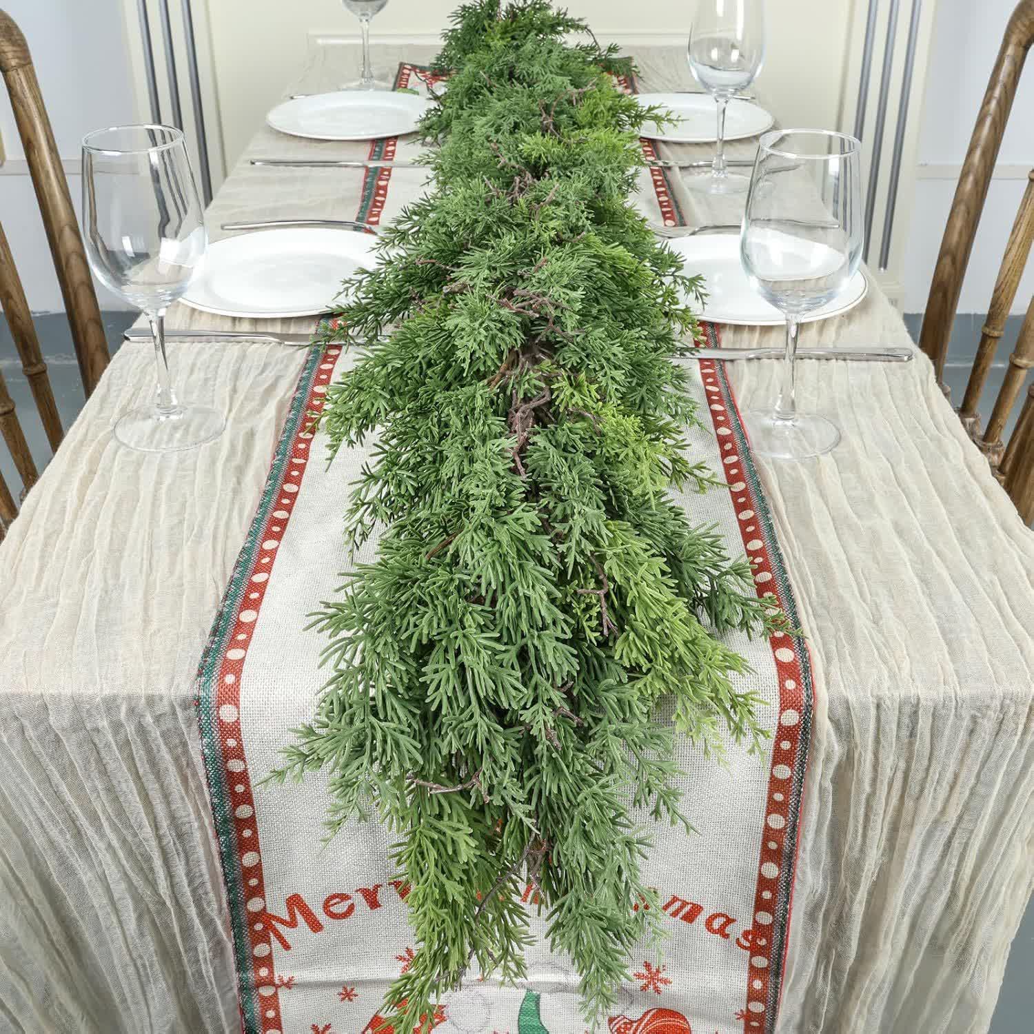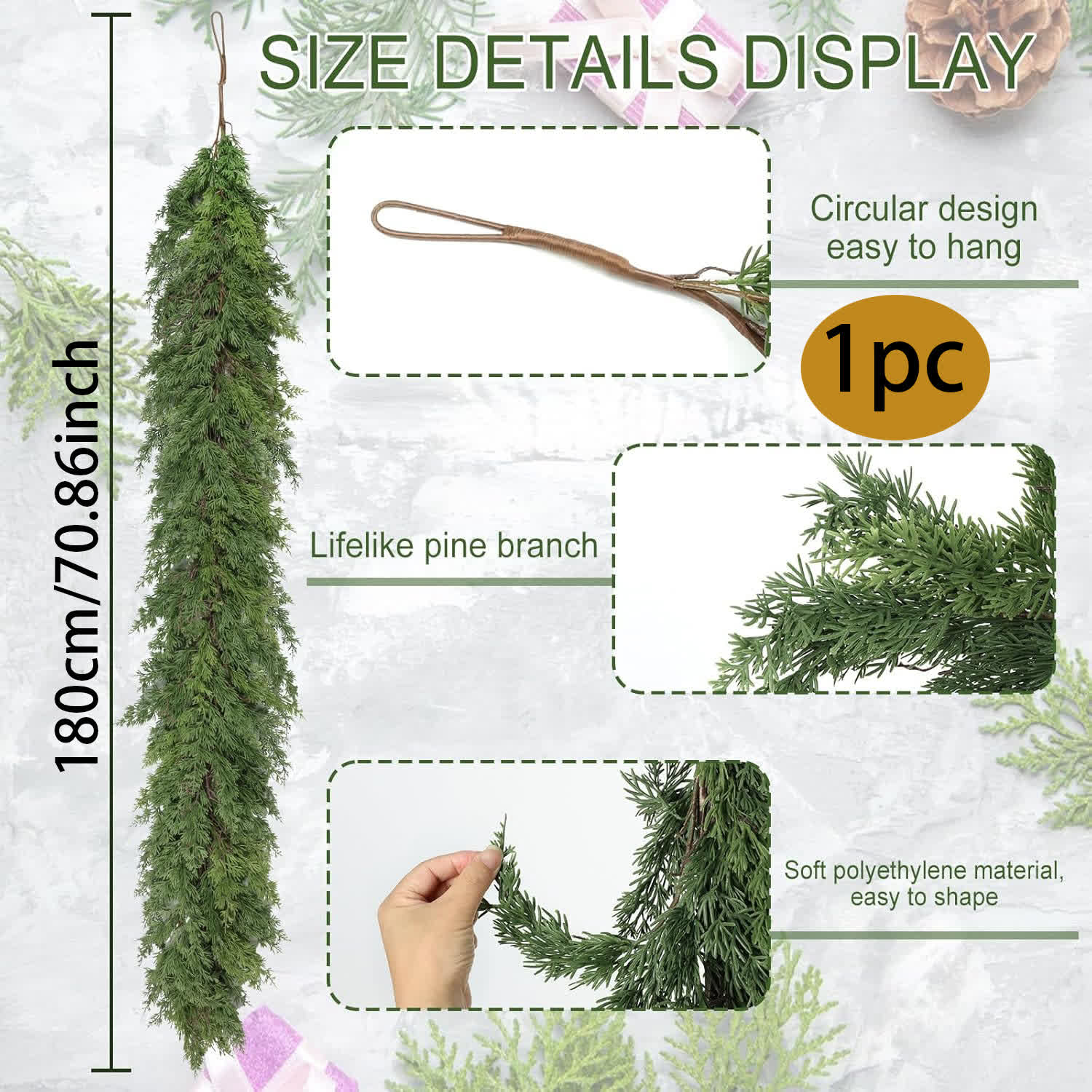 La guirlande présente des aiguilles de pin réalistes qui imitent l'apparence et la texture de la verdure fraîche, ajoutant un élément naturel à vos décorations de Noël. Leur texture douce en fait une véritable expérience tactile et assure un ajustement confortable comme décoration de table ou pièce maîtresse. Légère et facile à façonner, cette guirlande permet des arrangements créatifs sur les tables à manger, les manteaux de cheminée ou les décorations de table festives.