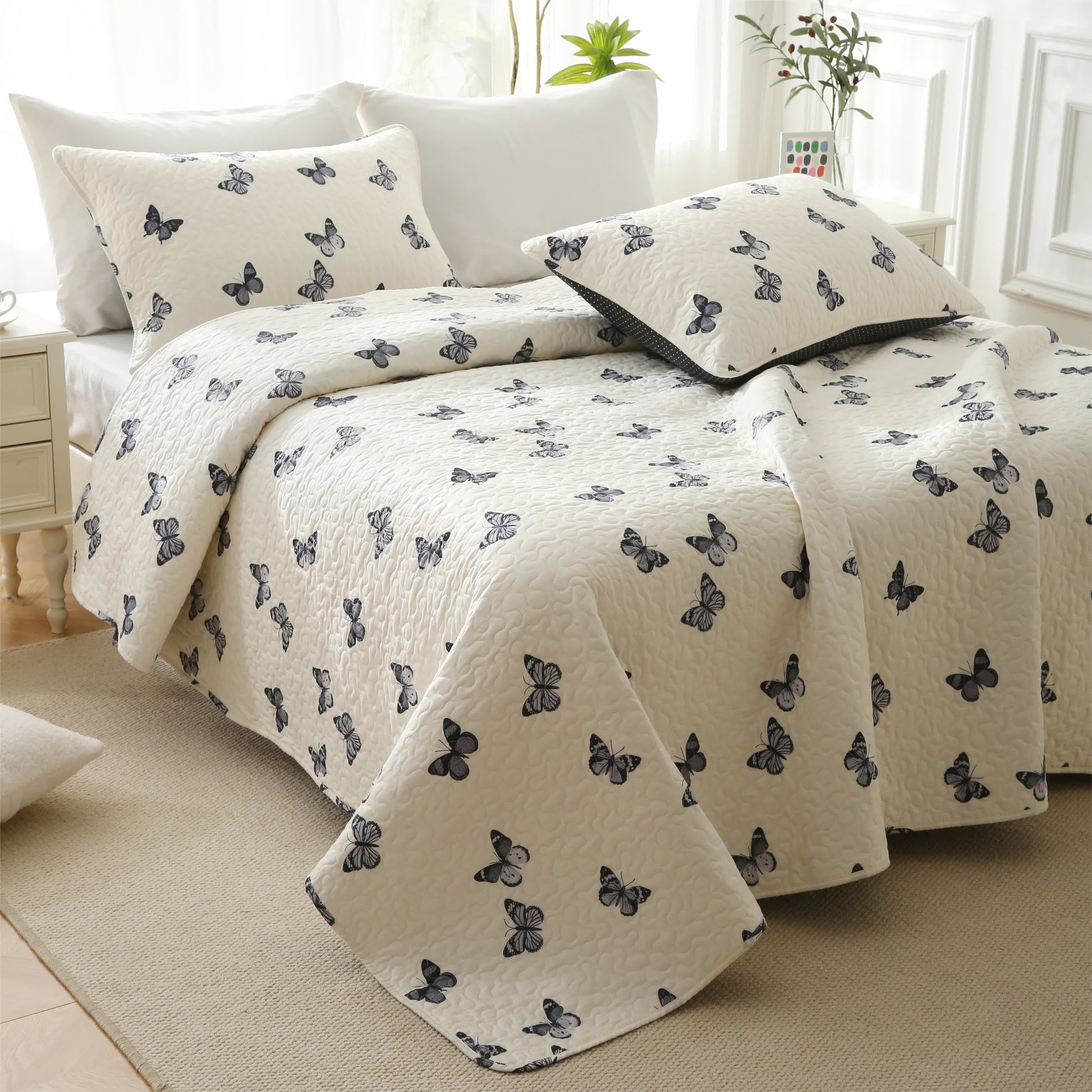 Le tissu doux et velouté en pur coton offre une sensation luxueuse tout en étant agréablement aéré et respirant. Avec des motifs de papillons enchanteurs flottant gracieusement sur la surface, ces courtepointes ajoutent une touche ludique mais élégante à votre espace de couchage.
