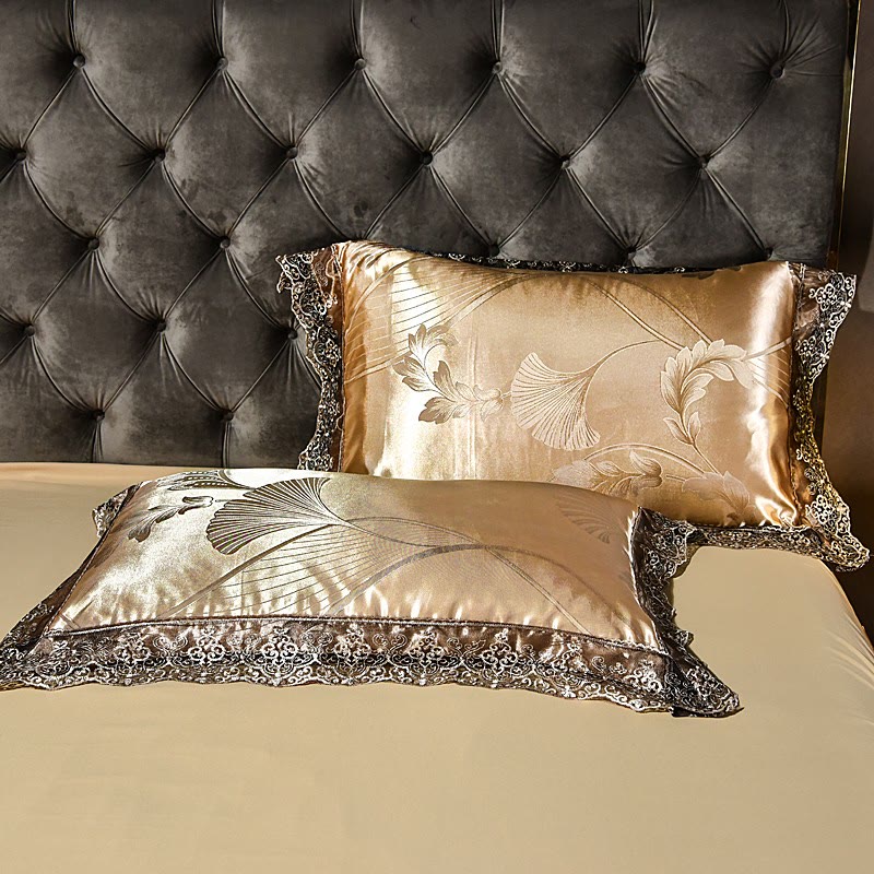 Parure de lit avec jupe de lit en satin et feuilles de ginkgo (4 pièces)