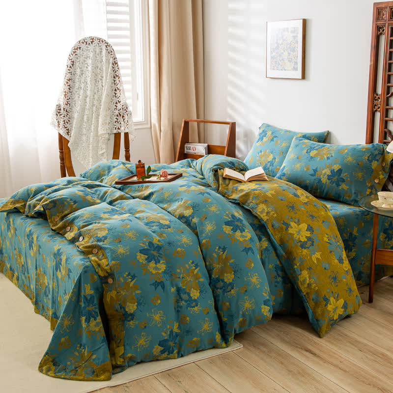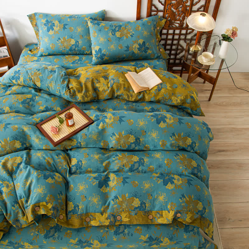 Rehaussez votre style de literie avec notre ensemble exquis qui offre une élégance rétro intemporelle. La housse de couette et les taies d'oreiller sont dotées de boutons qui ajoutent du style et de la fonctionnalité, les rendant faciles à mettre et à enlever. Fabriqué en pur coton avec double gaze, ce
