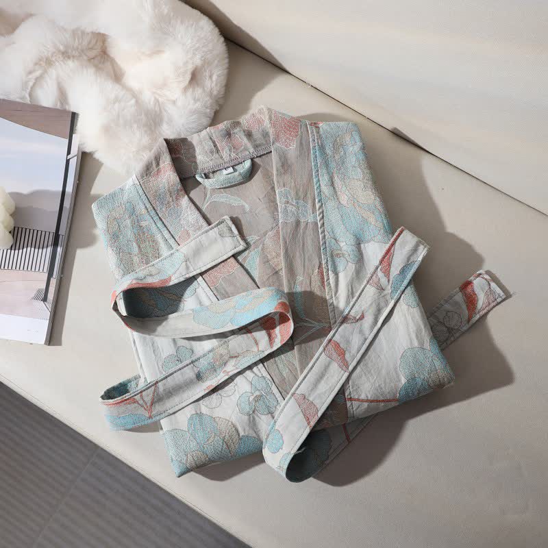 Peignoir unisexe en gaze de coton à motif pivoine bleue