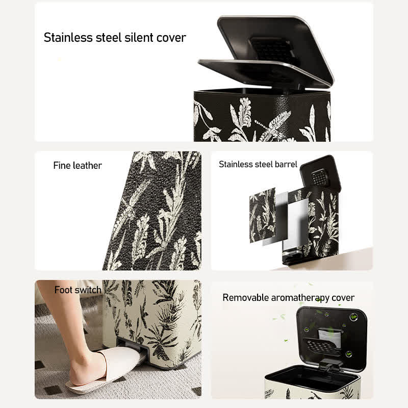 Cette poubelle présente une conception à double couche avec des seaux intérieurs et extérieurs, gardant le sac poubelle caché et combinant esthétique et fonctionnalité. Disponible en différentes tailles et designs pour répondre à différents besoins, il est fait de cuir de haute qualité et de matériaux renforcés et offre une sensation sophistiquée. La base antidérapante soigneusement conçue assure une assise sûre.